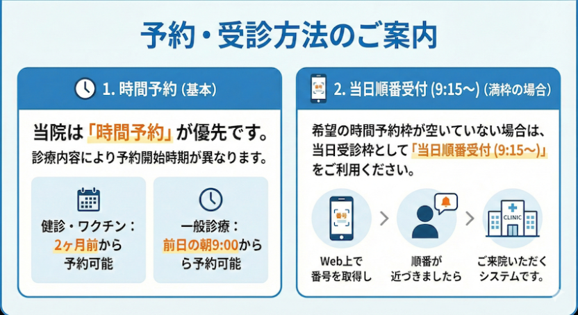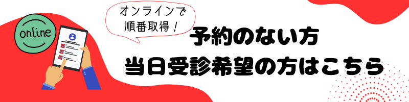 オンラインで順番予約を取得いただくシステムを導入しています。お子様の急な体調不良の際は、まずオンラインで順番をお取りいただき、ご来院ください。予約外でも対応可能ですので、安心してご利用ください。(詳しくはこちら)